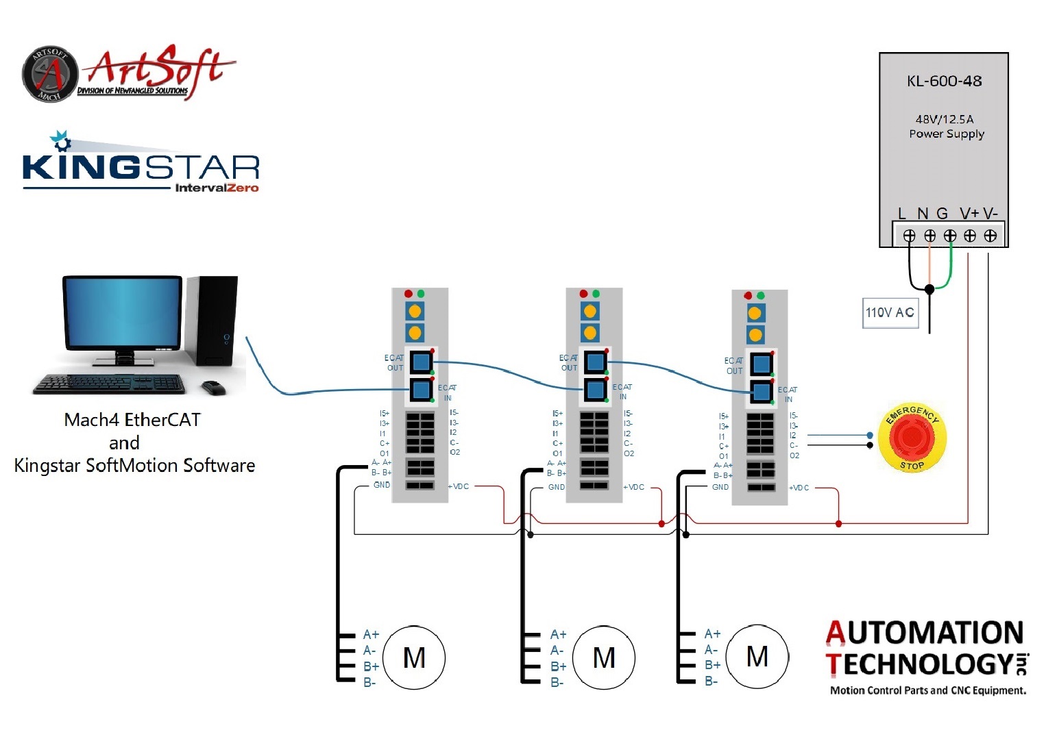 We worked with Newfangled Solutions and KINGSTAR, built this new CNC EtherCAT Motion Control System. It is fully pre-wired, tested and configured with Computer. So you do not need any Breakout Board, Ethernet board. You do not need to wire them any more